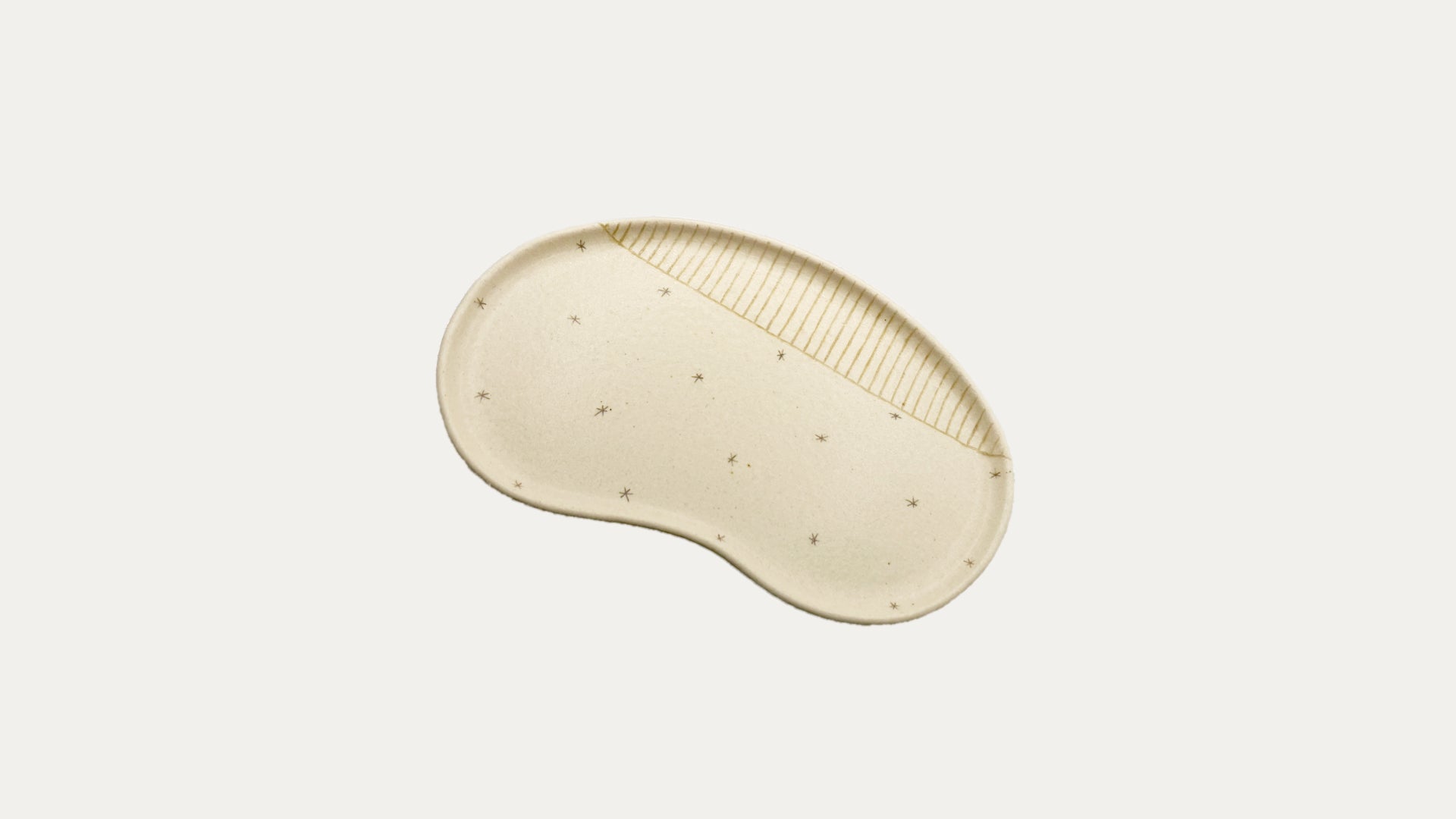 そら豆型のプレートに散りばめられた水玉模様が、テーブルにほっこりとした彩りを添えます。一つ一つ職人の手作業で仕上げられたぬくもり溢れる一枚です。