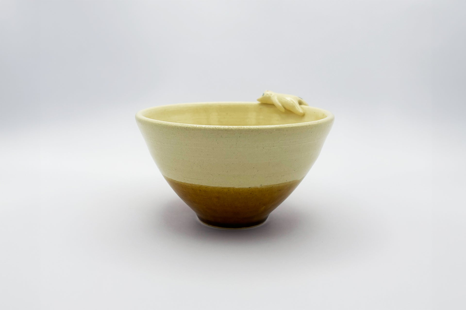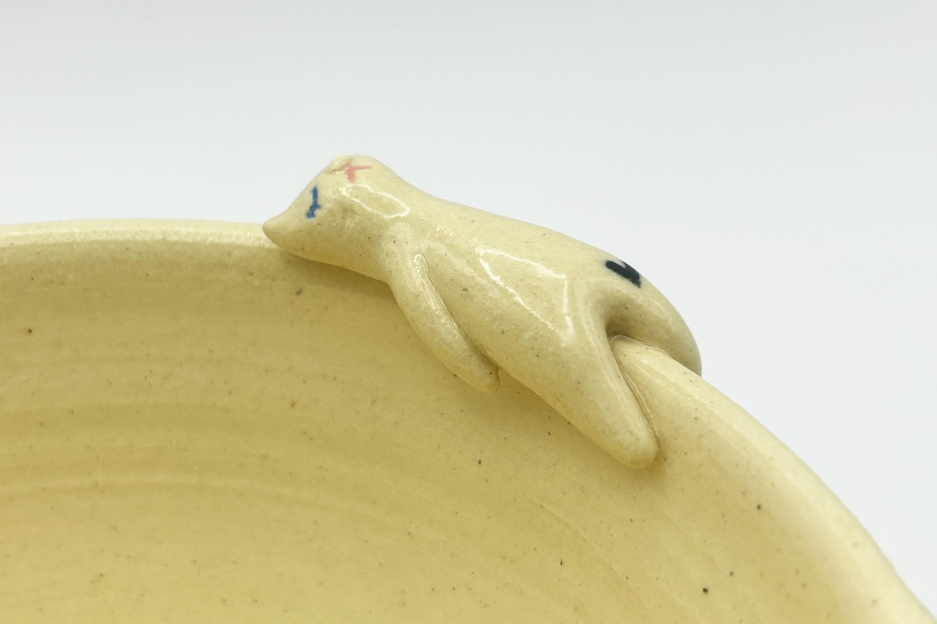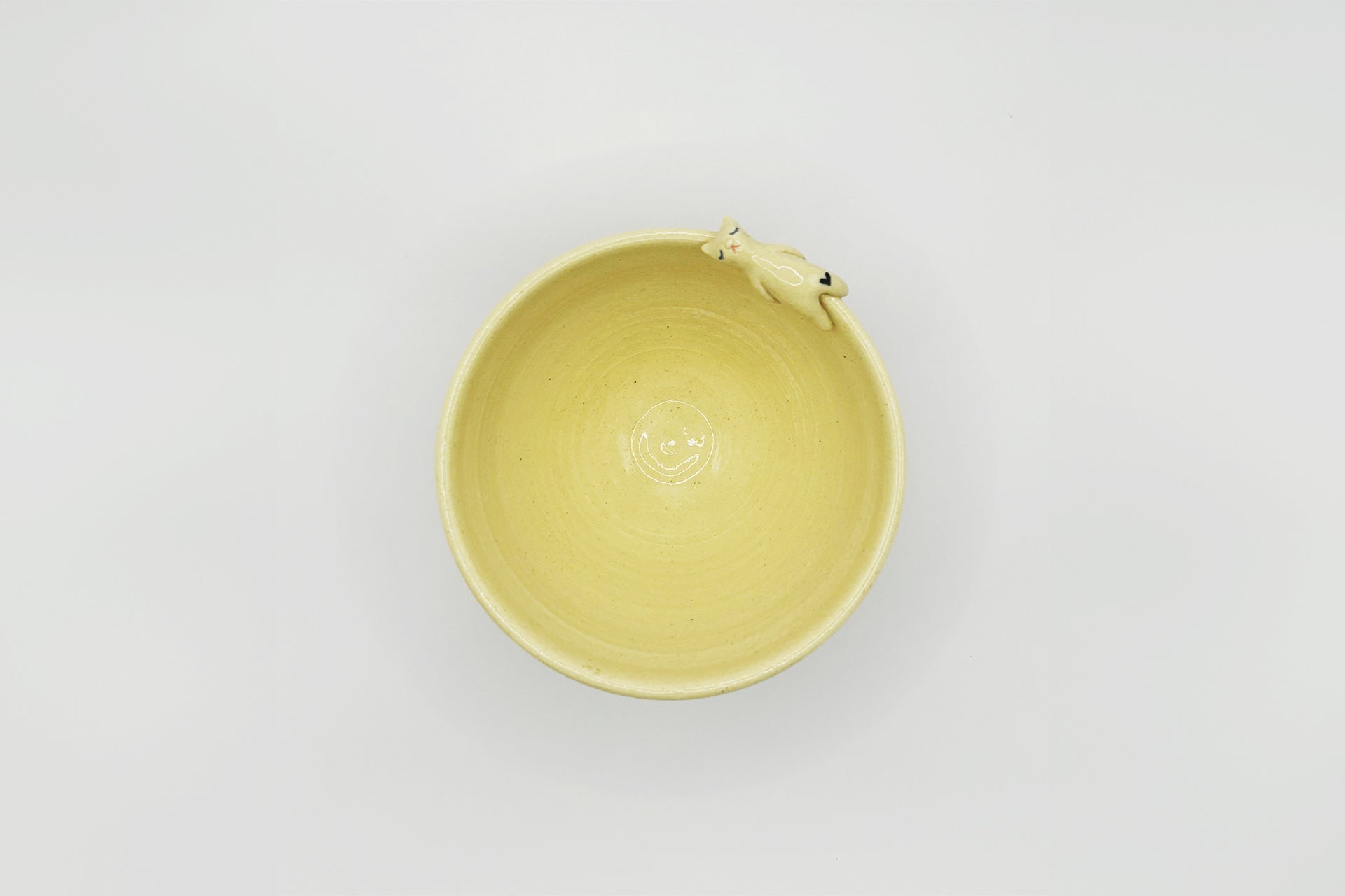 茶碗の縁には繊細に作られた小さな猫が寝転がっており、日常使いに適した愛らしいデザイン。この美しく実用的な信楽焼の茶碗は、猫好きな方への贈り物としてもおすすめです。