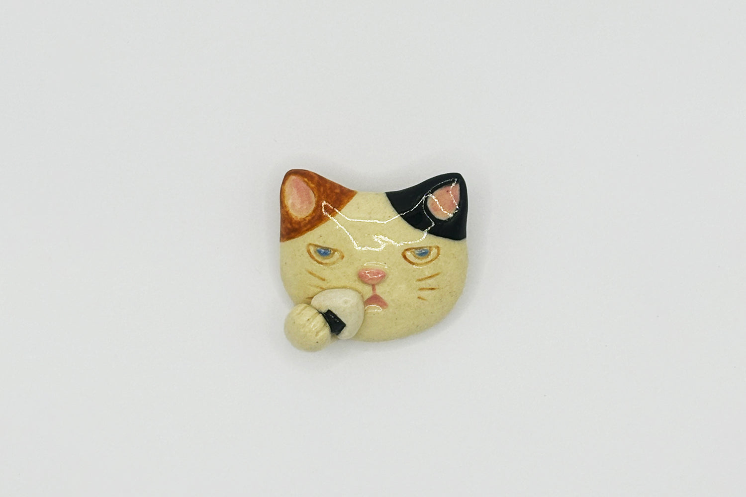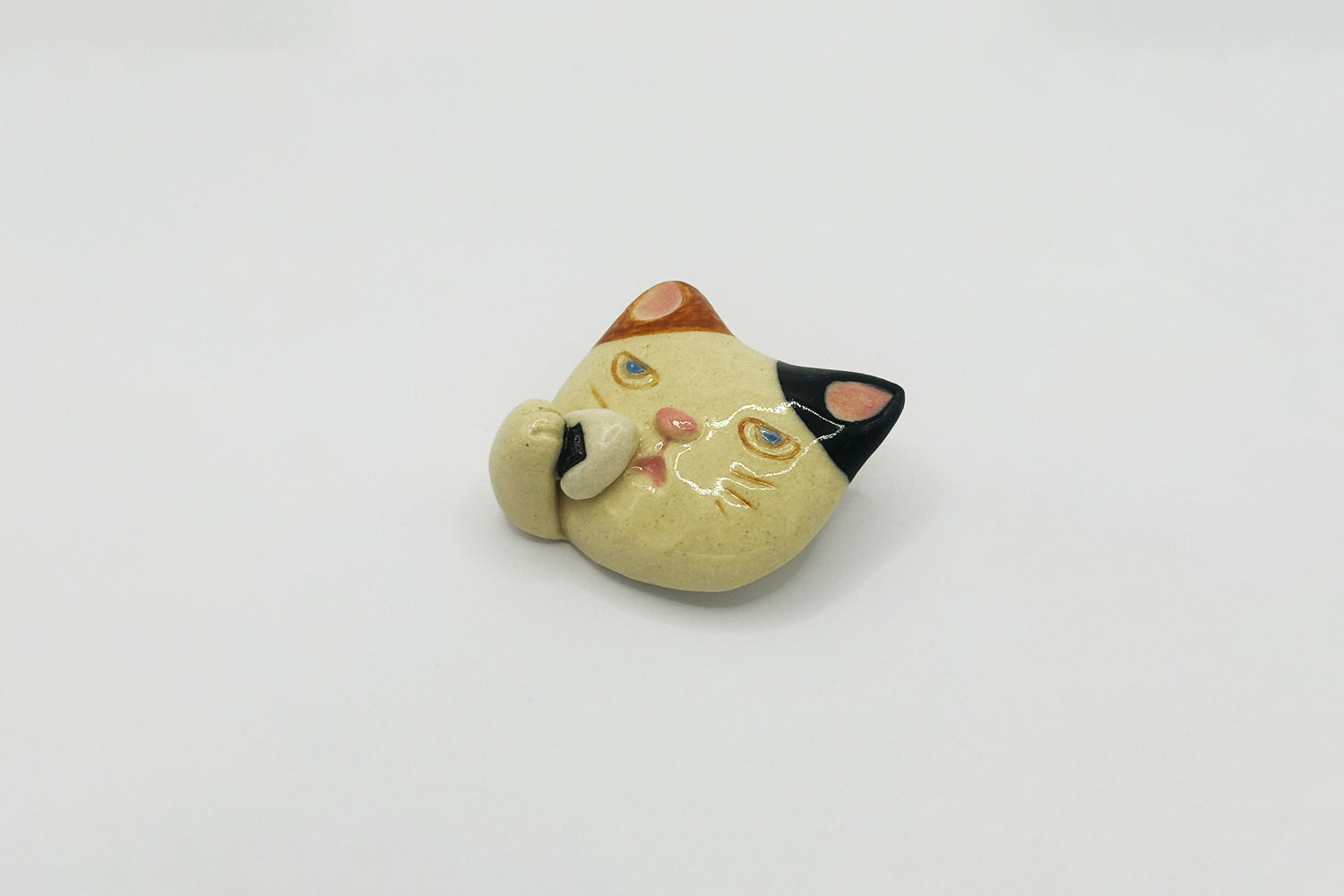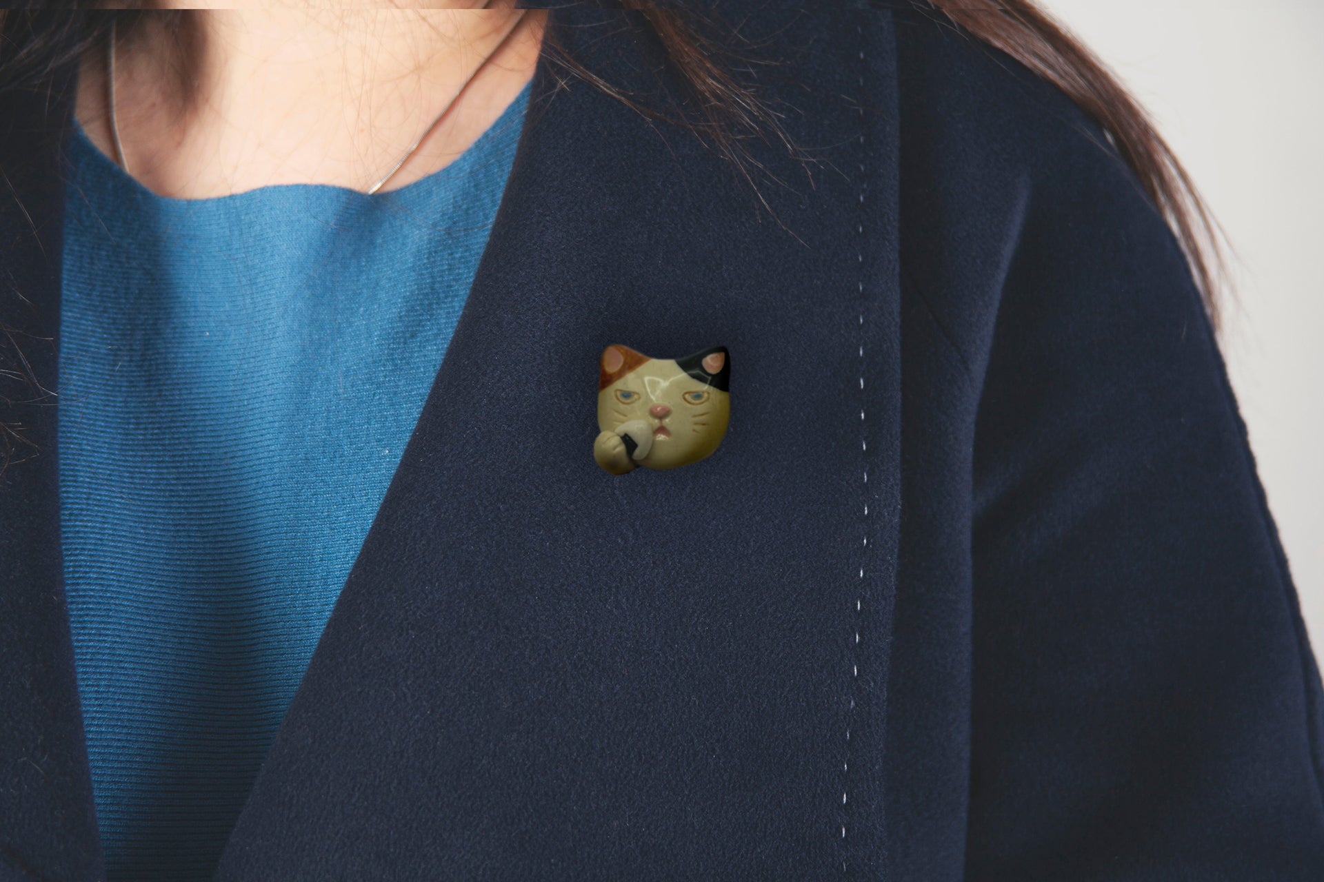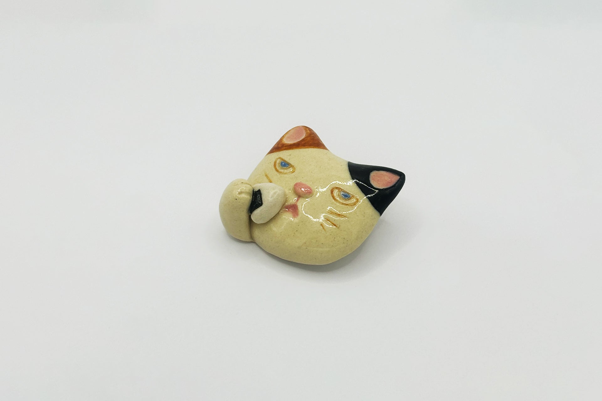 信楽焼の温もりある質感が特徴の猫のブローチ。一つひとつ手作りのため、それぞれ異なる表情に特別感があり、猫への愛をさりげなくアピールできます。
