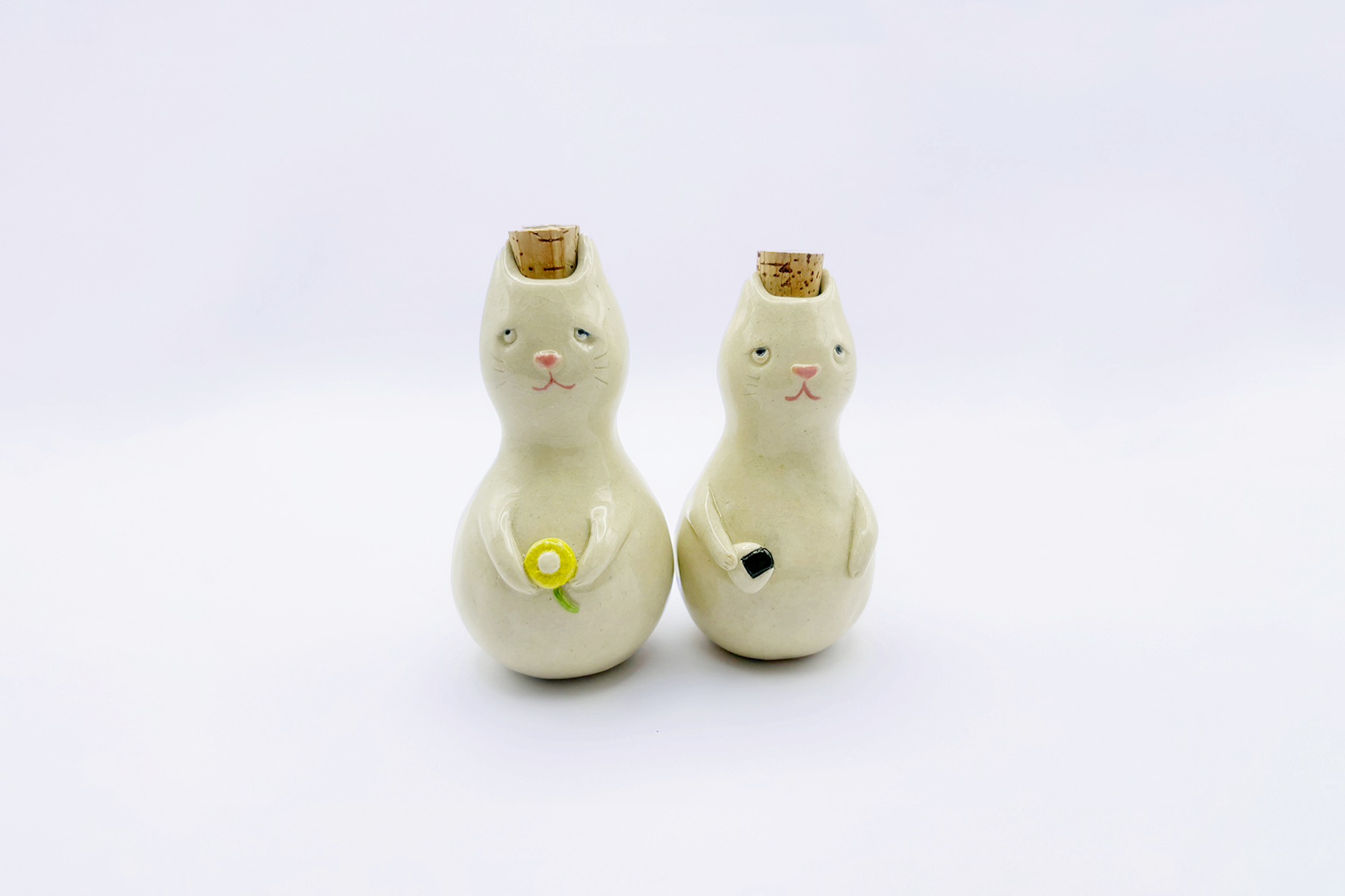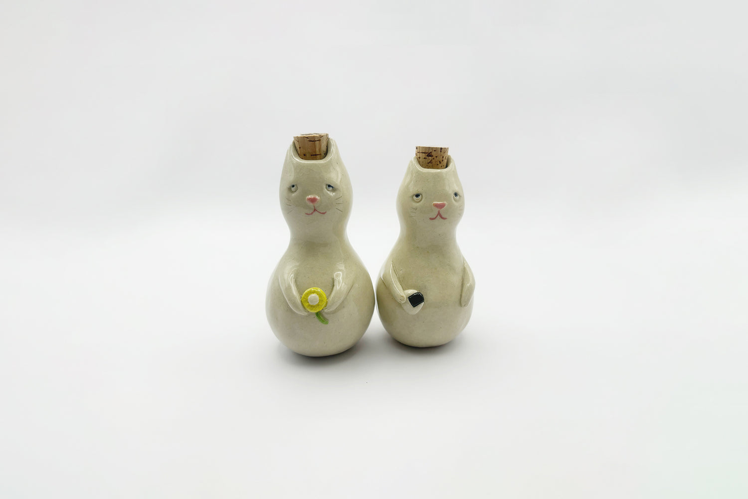 信楽焼の温もりある質感が特徴の猫の塩・こしょうセット。それぞれ個性豊かな表情を持ち、愛らしい存在感で食卓を彩ります。