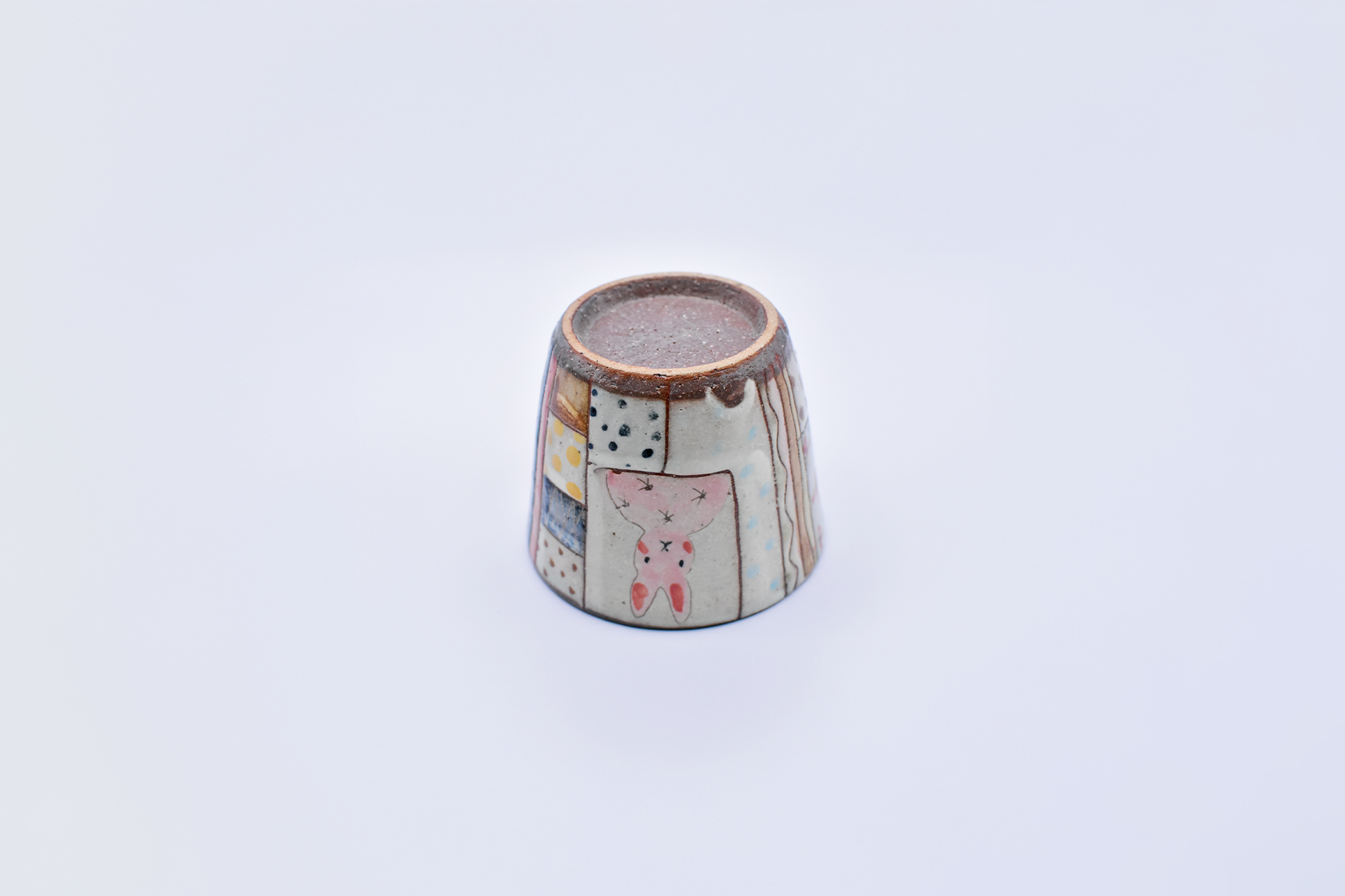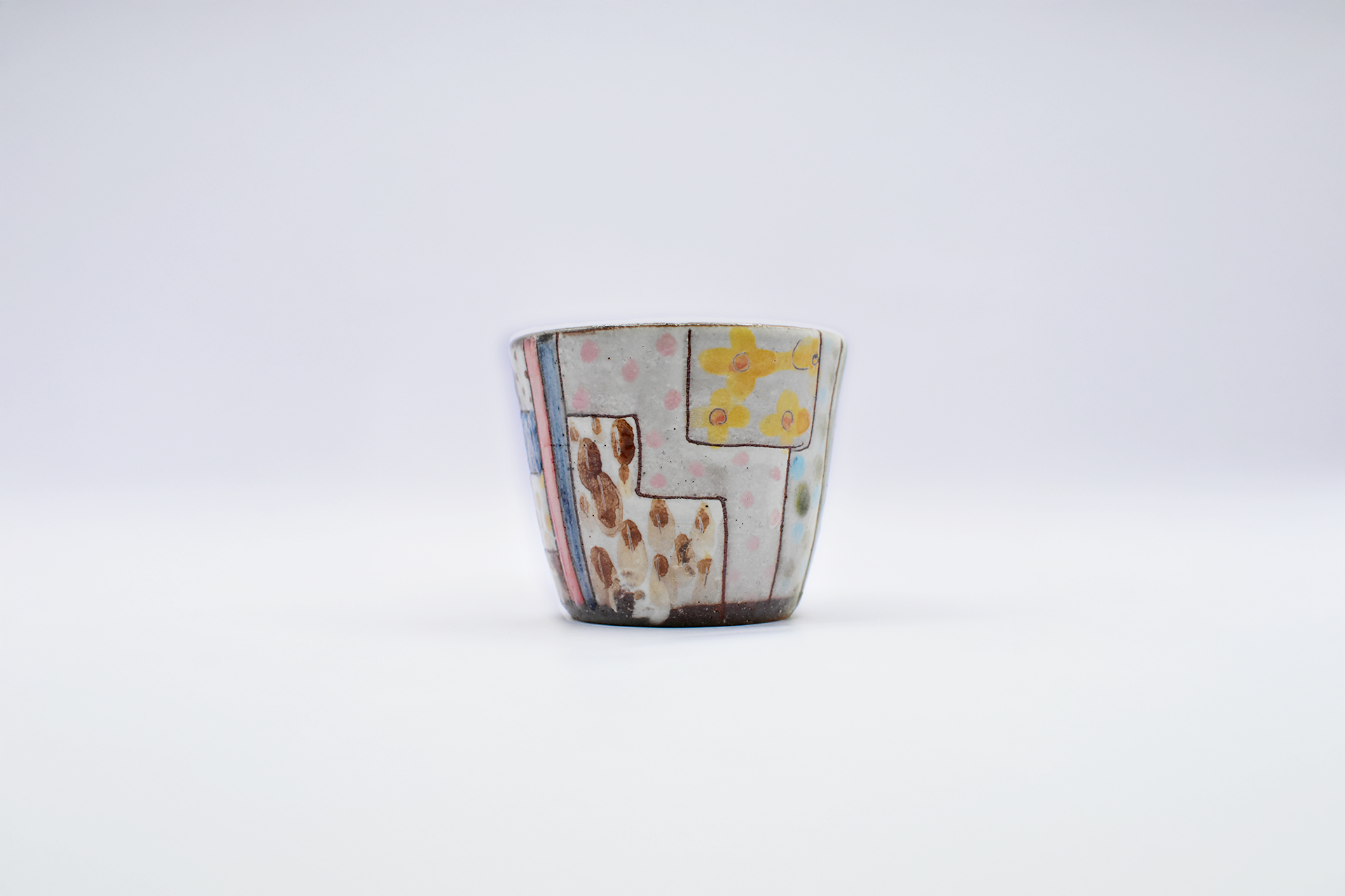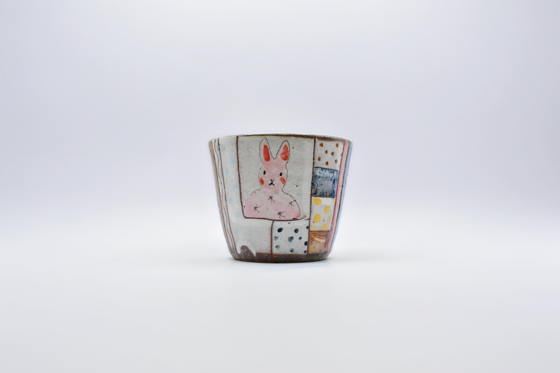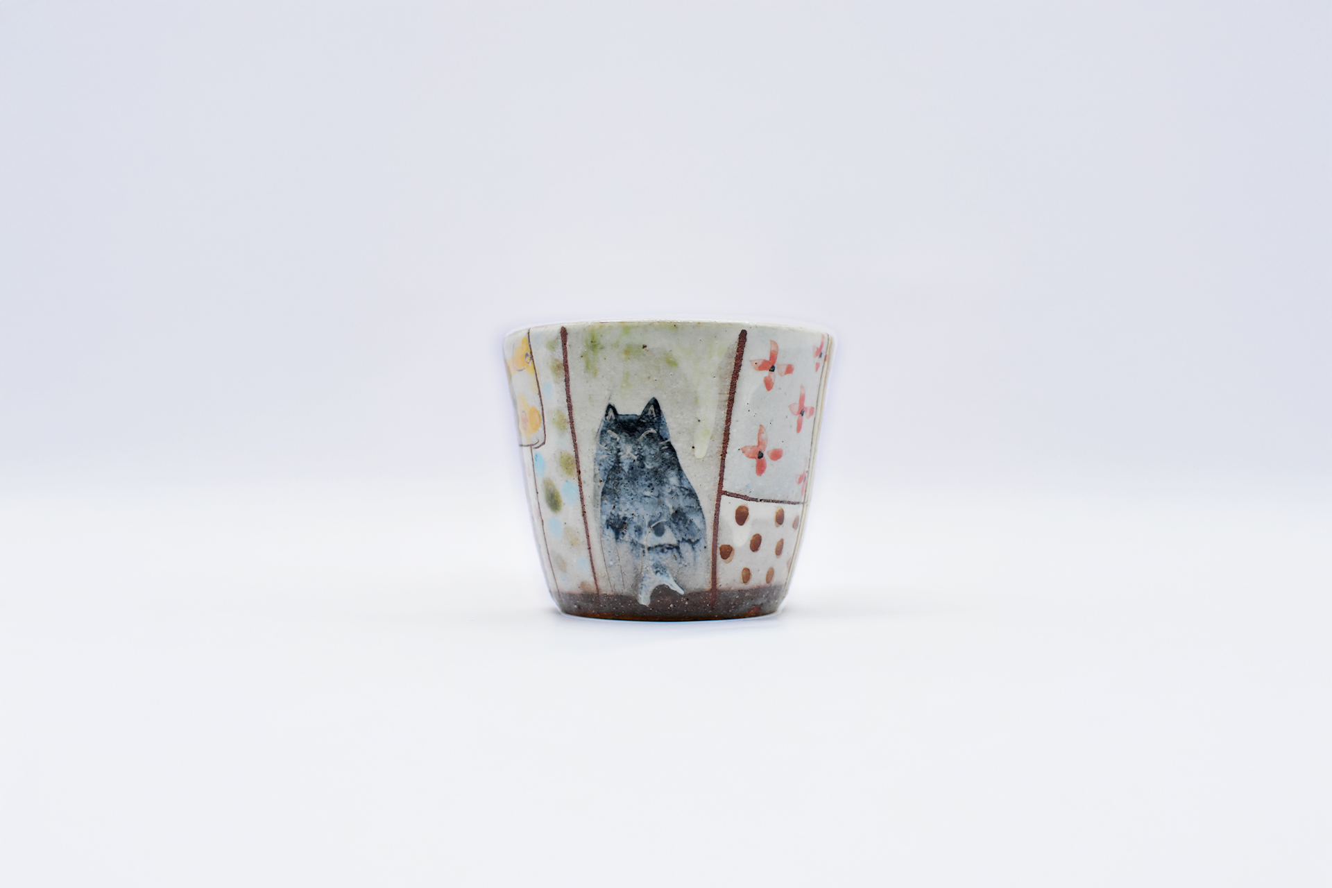 可愛らしい動物の絵が施された程よい大きさのカップ。絵付けに手間がかかるされるパッチワークのデザインは、作品ごとに変わる二つとないデザインです。